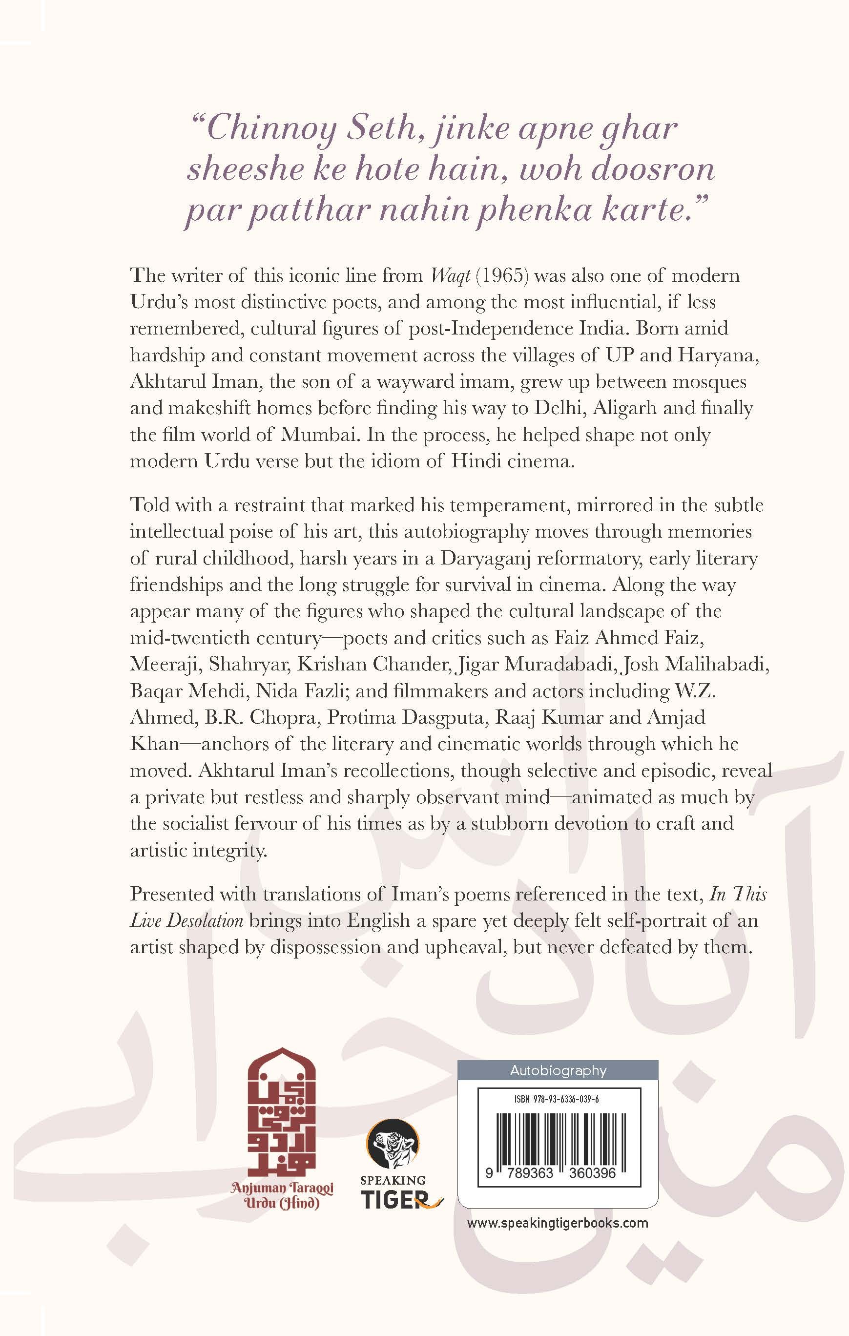 “Chinnoy Seth, jinke apne ghar sheeshe ke hote hain, woh doosron par patthar nahin phenka karte.” The celebrated autobiography of Akhtarul Iman, a modern poet who reshaped both Urdu verse and Hindi cinema dialogue. The writer of this iconic line from Waqt (1965) was also one of modern Urdu’smost distinctive poets, and among the most influential, if less remembered, cultural figures of post-Independence India. Born amid hardship and constant movement across the villages of UP and Haryana, Akhtarul Iman, the son of a wayward imam, grew up between mosques and makeshift homes before finding his way to Delhi, Aligarh and finally the film world of Mumbai. In the process, he helped shape not only modern Urdu verse but the idiom of Hindi cinema. Told with a restraint that marked his temperament, mirrored in the subtle intellectual poise of his art, this autobiography moves through memories of rural childhood, the harsh years in a Daryaganj reformatory, early literary friendships and the long struggle for survival in cinema. Along the way appear many of the figures who shaped the cultural landscape of the mid‑twentieth century—progressive poets and critics such as Faiz Ahmed Faiz, Meeraji, Shahryar, Krishan Chander, Jigar Muradabadi, Josh Malihabadi, Baqar Mehdi, Nida Fazli; and filmmakers and actors including W.Z. Ahmed, B.R. Chopra, Protima Dasgputa, Rajkumar and Amjad Khan—anchors of the literary and cinematic worlds through which he moved. Akhtarul Iman’s recollections, though selective and episodic, reveal a private but restless and sharply observant mind—animated as much by the socialist fervour of his times as by a stubborn devotion to craft and artistic integrity. Presented with translations of Iman’s poems referenced in the text, In This Live Desolation brings into English a spare yet deeply felt self-portrait of an artist shaped by dispossession and upheaval, but never defeated by them.